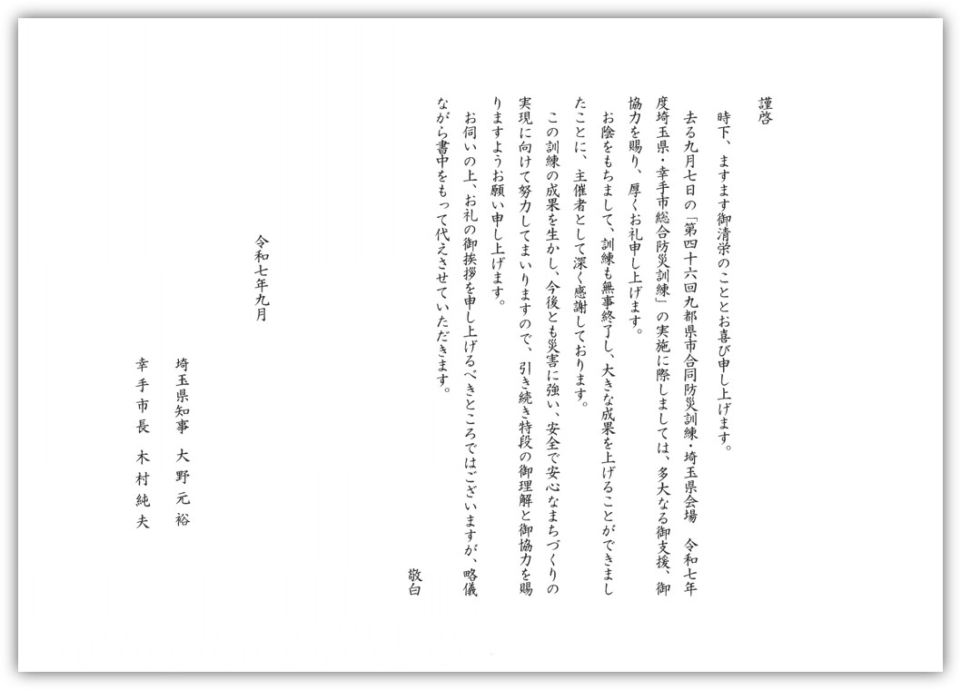 埼玉県知事・幸手市長より御礼状を頂戴いたしました 当社は、2025年9月7日に開催された「第46回九都県市合同防災訓練 防災フェア」に出展いたしました。 出展に際し、埼玉県知事および幸手市長より御礼状を賜りましたことをご報告いたします。 今後も地域の防災力向上に貢献できるよう、取り組みを続けてまいります。