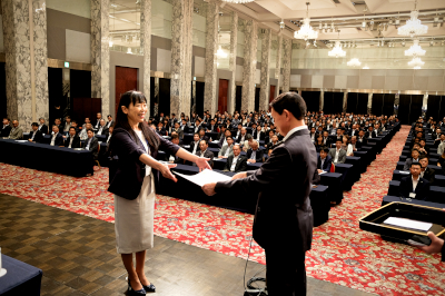 ![]() 永年勤続表彰は毎年の社員総会の場で、社長から一人ひとりに表彰状、記念品が手渡されます。