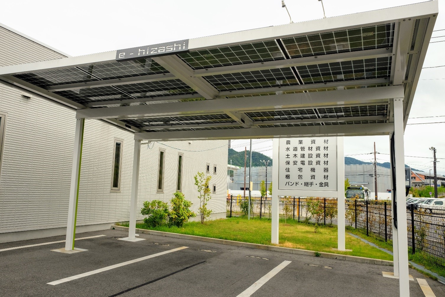 【実績例1】 (株)カクイチ様とパートナー提携し、駐車場の屋根部に太陽光パネルを設置し、売電協力しています。