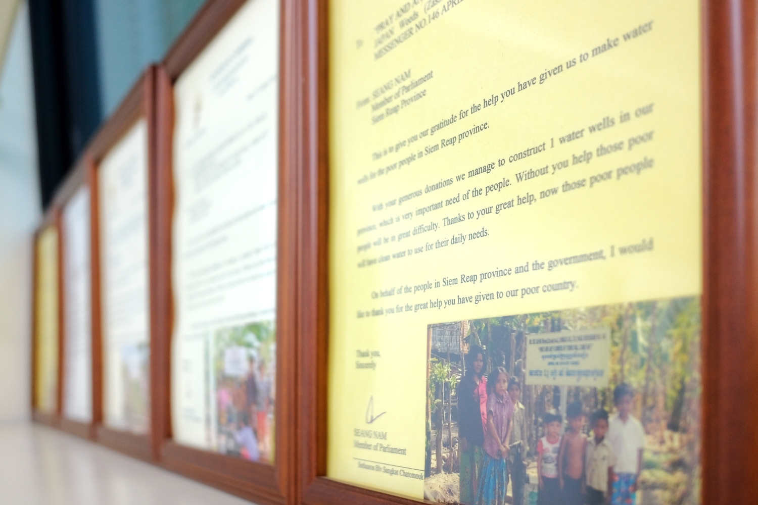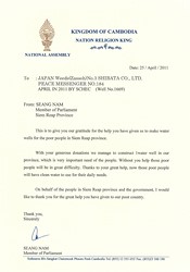 | 7. | 寄付活動について当社は、特定非営利活動法人 カンボジアの健康及び教育と地域を支援する会(SCHEC)を通じてカンボジアを支援しています。「株式会社 世界地図」を通して、地図にかかる費用の一部を寄付、カンボジアの井戸完成の都度、感謝状と写真が寄贈されています。