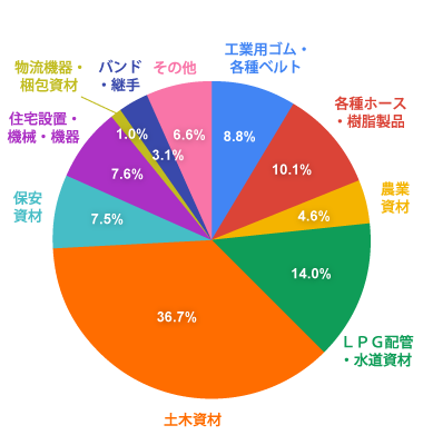 事業目的 工業用ゴム・プラスチック製品の製造・販売、照明器具の製造・販売、防除機器の製造・販売、LPG配管器材、農業資材、水道管材、住設機器、土木建設資材、保安電設資材の製造・販売、梱包資材、その他付属品及び関連商品の製作・加工・販売・各種工事施工(屋根工事・電気工事・大工工事・建具工事・内装仕上工事・ガラス工事・防水工事・塗装工事・板金工事・タイル、れんが、ブロック工事・信号装置設置・さく井工事)及び付帯する一切の業務、建築工事業、とび・土木工事業、鋼構造物工事業