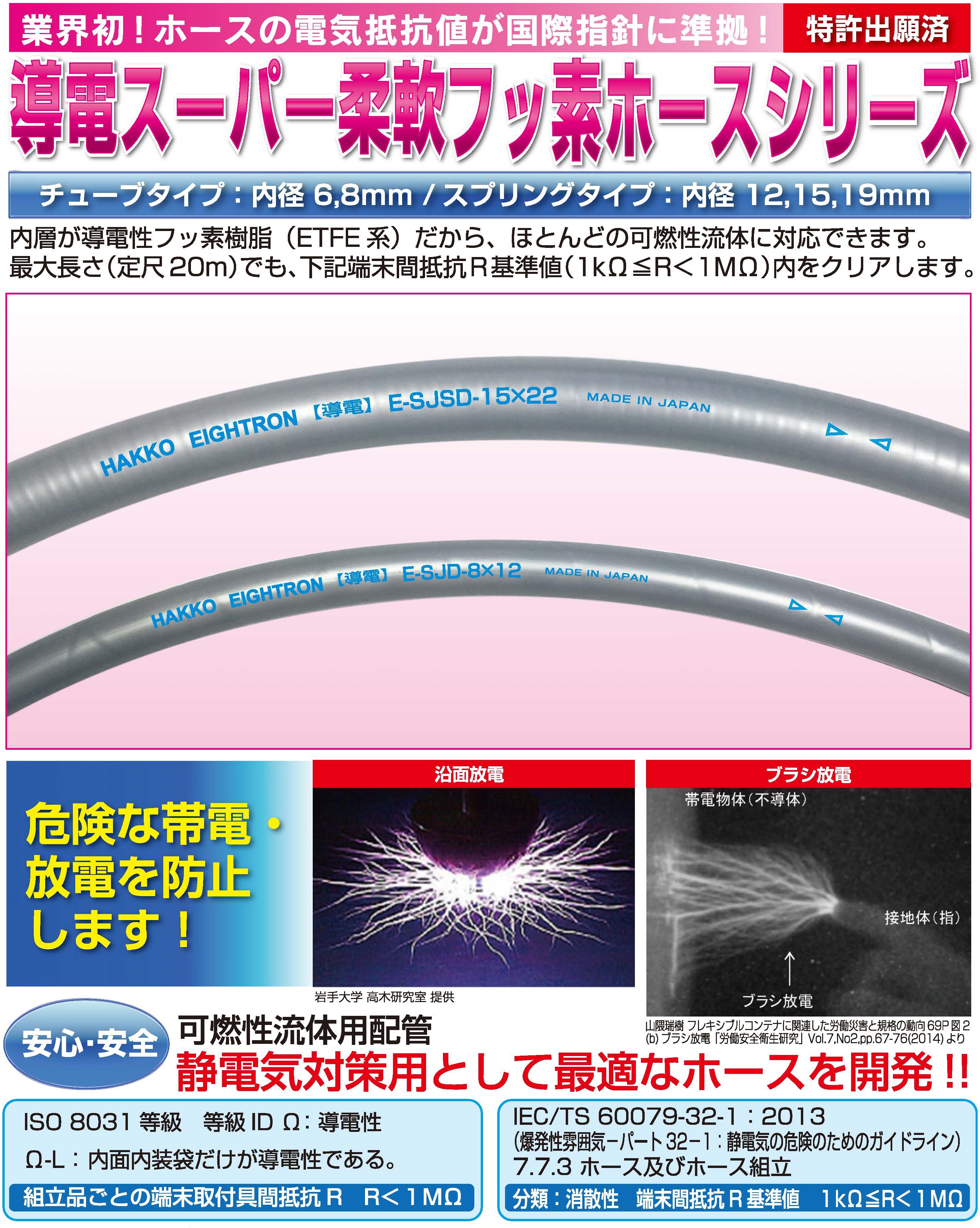 導電スーパー柔軟フッ素シリーズ 業界初!ホースの電気抵抗値が国際指針に準拠! 可燃性液体の移送に伴う静電気を使用長さに関わらず安全に除電できる。 全数、規格に準じた社内規定の品質検査を実施しています。 (商品詳細ページが開きます) (商品詳細ページが開きます)