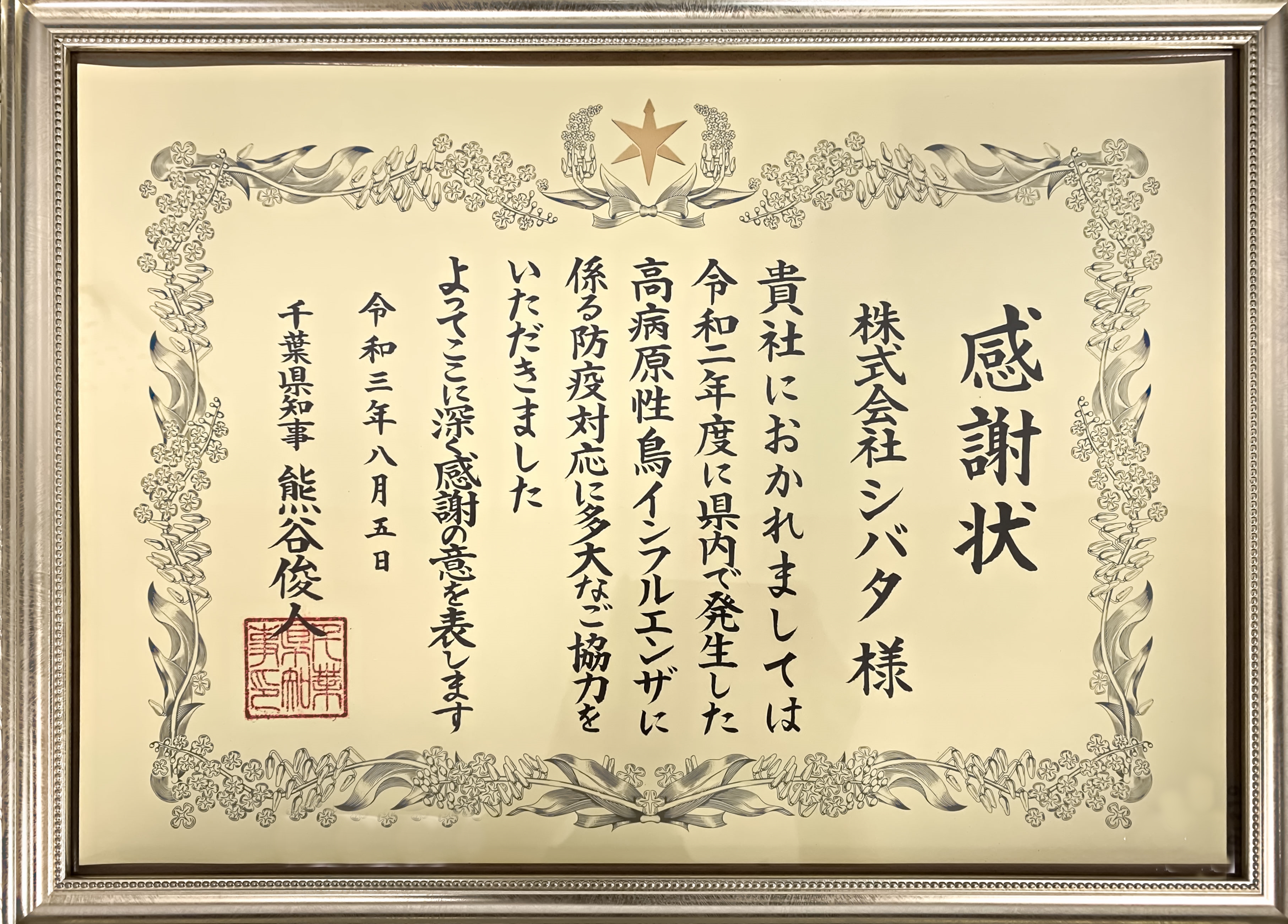 2020年12月より2021年2月にかけ、千葉県内で発生致しました鳥インフルエンザに係る資材の当社の対応に対し、千葉県庁、千葉県農林水産部畜産課より千葉県知事名にて感謝状を頂戴致しました。