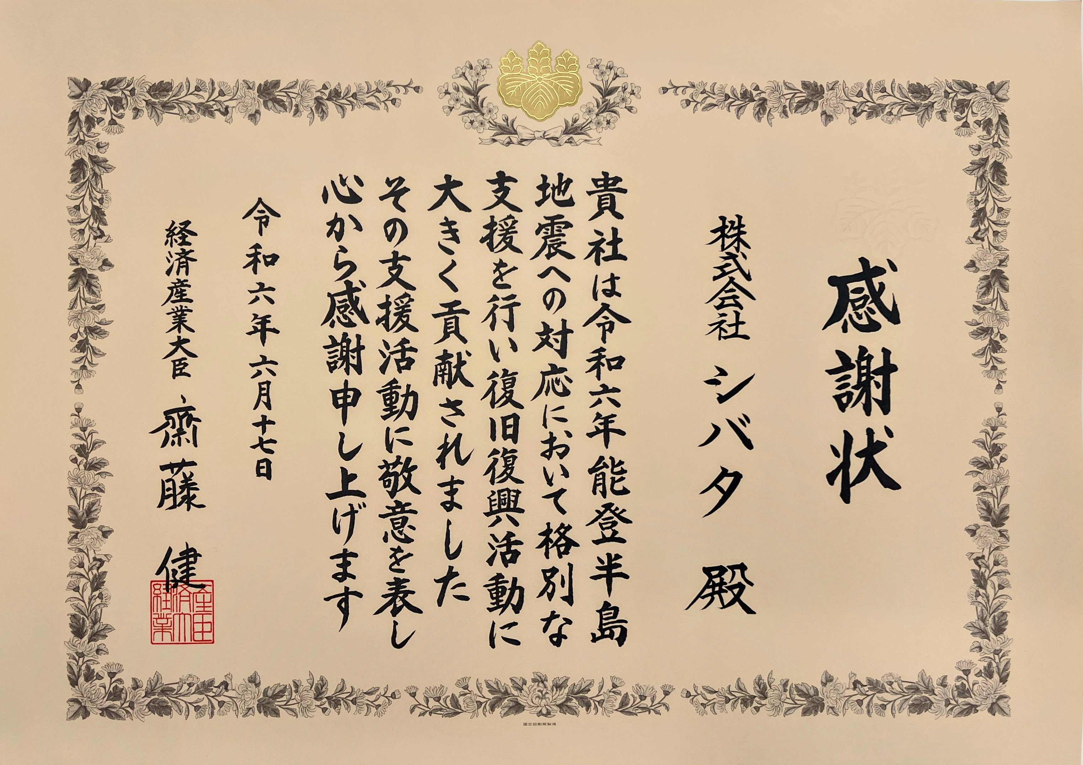 令和6年能登半島地震の復旧対応等に貢献した企業・団体として経済産業省より感謝状が授与されました