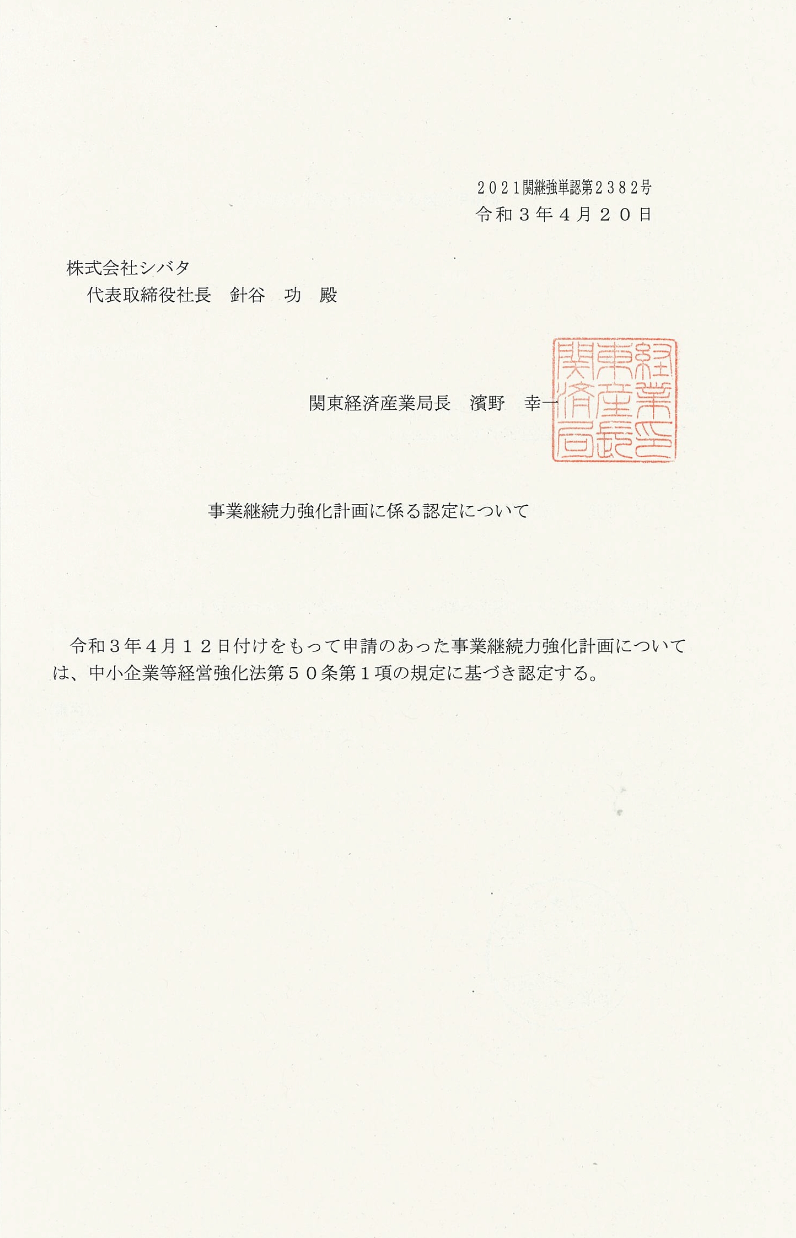 専門商社シバタ 経済産業省「事業継続力強化計画」認定取得 令和3年4月12日付にて、中小企業が策定した防災・減災の事前対策に関する計画を経済産業大臣が認定する制度である「事業継続力強化計画」の認定を受けました。